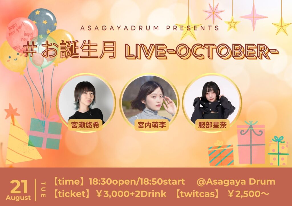 #お誕生月LIVE -October- イベント詳細 日付: 2025年10月21日 16:00 – 22:00 カテゴリ: 夜 服部星奈/宮内萌李/宮瀬悠希 and more! 開場18:30 開演18:50 3,000円+2ドリンク(うち1杯は出演者におごり可) 観覧予約フォーム:https://asagaya-drum.com/reservation/ ツイキャスプレミア:お待ちください