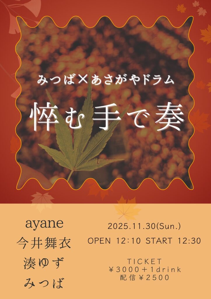 みつば×あさがやドラム第3弾 『悴む手で奏』 イベント詳細 日付: 2025年11月30日 10:00 – 16:00 カテゴリ: ピックアップ3, 昼 ayane/今井舞衣/湊ゆず/みつば OPEN 12:10 / START 12:30 来場 3000円+1D 配信2500円