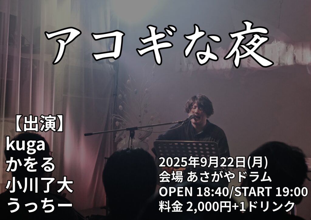 アコギな夜 2025年9月 イベント詳細 日付: 2025年9月22日 18:00 – 22:00 カテゴリ: 夜 kuga・かをる・小川了大・うっちー 時間:18:40open/19:00start 料金:2,000円+1ドリンク
