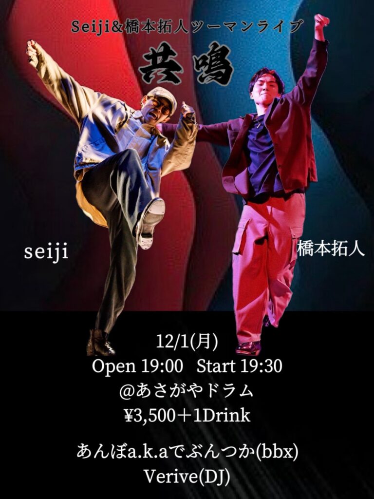 Seiji&橋本拓人ツーマンライブ“共鳴” イベント詳細 日付: 2025年12月1日 16:00 – 22:00 カテゴリ: 夜 Seiji・橋本拓人・あんぼa.k.aでぶんつか・Verive Open 19:00 Start 19:30 ¥3,500 + 1Drink