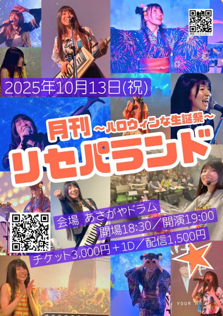 月刊リセパランド2025年10月号『ハロウィンな生誕祭🎃🎂』 イベント詳細 日付: 2025年10月13日 16:00 – 22:00 カテゴリ: ピックアップ2, 夜 【出演】理星 開場18:30/開演19:00 【チケット】 ・予約 3,000円(別途要1ドリンク) ・当日 3,500円(別途要1ドリンク) ・配信 1,500円 (予約URLはお待ちください)