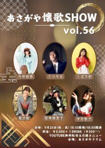あさがや懐歌SHOW vol.56 2025年9月23日 16:00 – 22:00 あさがや懐歌SHOW vol.56 今井結香・我竜麻里子・こばち彩・鷺沢柚・寺井智子・てつやま 時間:18:10open/18:30start 料金:3,000円+1D 【観覧予約】 https://asagaya-drum.com/reservation/ 【YouTube無料配信】 https://youtube.com/live/EmnnbD1jGMY 【応援メニュー】 おまちください