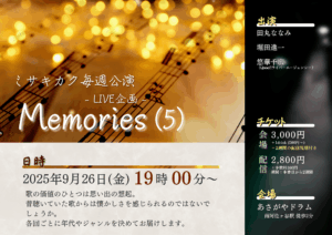 -LIVE企画- Memories(5)ミサキカク毎週公演 2025年9月26日 16:00 – 22:00 -LIVE企画- Memories(5)ミサキカク毎週公演 田丸ななみ、緒方瑠美、悠華千広 【時間】開場 19:00/開演 19:30 【料金】 《会場》¥3,000(+1ドリンク¥500〜) 《配信》¥2,800(+手数料¥160) https://misakikaku-weekly.hp.peraichi.com/0926