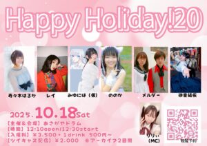 Happy Holiday!20 2025年10月18日 10:00 – 16:00 Happy Holiday!20 榊音結依・寿々木はるか・ののか・みゆには(仮)・メルダー・レイ・りりぃ(兼MC) 12:10open / 12:30start(配信スタート) ¥3,500+1D¥500~ 予約制 【観覧予約】https://asagaya-drum.com/reservation/ 【ツイキャスプレミア】 視聴2500円~ アーカイブ2週間 おまちください 【ドリンク応援&物販サイト】 おまちください