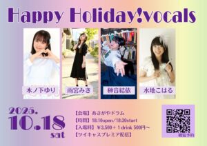 Happy Holiday!vocals 2025年10月18日 16:00 – 22:00 Happy Holiday!vocals 雨宮みき・木ノ下ゆり・榊音結依・水地こはる 18:10open/18:30start(配信スタート) ¥3,500+1drink 500円~ 【観覧予約】https://asagaya-drum.com/reservation/ 【ツイキャスプレミアム】※アーカイブ2週間 お待ちください 【ドリンク応援ページ】おまちください。