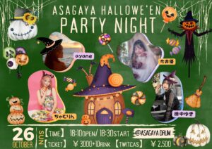 ASAGAYA Hallowe’en Party Night 2025年10月26日 16:00 – 22:00 ASAGAYA Hallowe’en Party Night ayane・今井優・田中ゆき・ちゃむりん 18:10 open/18:30 start 【料金】¥3,000+1d 【観覧予約】https://asagaya-drum.com/reservation/ 【ツイキャスプレミア配信】視聴¥2,500~ 【ドリンク応援】1杯¥500 ※お客様も是非コスプレを楽しんでください、コスプレ参加の人にはお菓子をプレゼント
