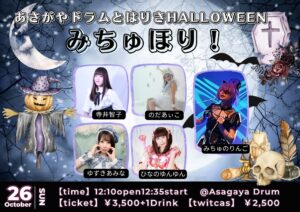 みちゅほり!あさがやドラムとはりきりHalloween 2025年10月26日 10:00 – 16:00 みちゅほり!あさがやドラムとはりきりHalloween みちゅのりんご・寺井智子・のだあぃこ・ひなのゆんゆん・ゆずきあみな OPEN 12:10/START12:35 入場3.500円+drink代 【観覧予約ページ】https://asagaya-drum.com/reservation/ ツイキャス配信2.500円 スペシャル特典付き配信5.000円