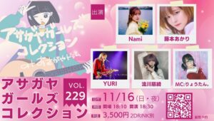 アサガヤガールズコレクションVol.229 2025年11月16日 16:00 – 22:00 アサガヤガールズコレクションVol.229 【出演】Nami・YURI・藤本あかり・流川慈綺 ほか 【MC】りょうたん。 開場 18:10 開演 18:30 〈会場観覧〉3,500円(2ドリンク別) 【観覧予約フォーム】 〈mahocastライブ配信〉 3,000円(メッセージ動画特典つきスペシャルチケット♪) 1,000円(視聴のみ) ※ドリンクおごる、ストーン(投げ銭)もあり 【ネットチケット購入サイト】