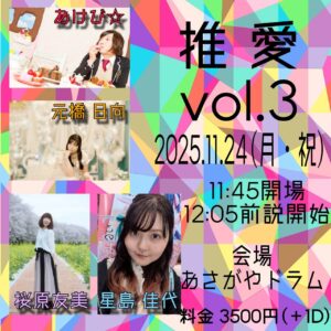 推愛 vol.3 2025年11月24日 10:00 – 16:00 推愛 vol.3 あけび☆、桜原友美、星島佳代、元橋日向 時間:11:45open/12:05start 料金:3500円+1ドリンク 主催SNS:https://x.com/akanekogami