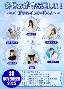 冬休みが待ち遠しい!~アニボカ ウインターパーティ!~ 2025年11月30日 16:00 – 22:00 冬休みが待ち遠しい!~アニボカ ウインターパーティ!~ 大野敦子・おくみずき・齋藤亜里菜・しおたん・風遊・宮瀬悠希 18:10open/18:30start 料金:会場 3500円+1Drink ツイキャスプレミア配信: 2500円 ~ ※基本スタンディングのイベントとなります。予備的な席を少しだけ準備します。