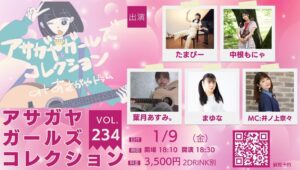 アサガヤガールズコレクションVol.234 2026年1月9日 16:00 – 22:00 アサガヤガールズコレクションVol.234 【出演】たまぴー・中根もにゃ・葉月あすみ。・まゆな ほか 【MC】井ノ上奈々 開場 18:10 開演 18:30 〈会場観覧〉3,500円(2ドリンク別) 【観覧予約フォーム】 〈mahocastライブ配信〉 3,000円(メッセージ動画特典つきスペシャルチケット♪) 1,000円(視聴のみ) ※ドリンクおごる、ストーン(投げ銭)もあり 【ネットチケット購入サイト】