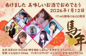 あけました 美味しいお酒でおめでとう2026 2026年1月12日 16:00 – 22:00 あけました 美味しいお酒でおめでとう2026 2026年1月12日(祝・夜) 会場:あさがやドラム 出演:雨宮みき・羽月みお・榊音結依・しおたん・寺井智子・みちゅのりんご 時間:17:40開場/18:00開演 金額:¥3,500+1Drink ※鏡割りをします ・樽酒 桧升付き1杯¥1,000(おかわり¥500) ・樽酒 飲み放題¥3,500(桧升付き) ツイキャス¥2,500 アーカイブ2週間
