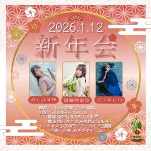 新年会ライブ 2026年1月12日 10:00 – 16:00 新年会ライブ おくみずき・齋藤亜里菜・ミツキルリ 時間:11:40 開場 12:00 開演 料金:3,000円 +1Drink ☆樽酒 桧升付き1杯 1,000 円 ☆樽酒 桧升付き 飲み放題 3,500 円 ツイキャス 3,000円 ※アーカイブ2週間 企画・会場 あさがやドラム
