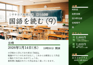 国語を読む(9) ミサキカク毎週公演 2026年1月14日 16:00 – 22:00 国語を読む(9) ミサキカク毎週公演 阿野結、鈴野真輝、波多野花緒、宮﨑翔平、他 【時間】開場 19:00/開演 19:30 【料金】 《会場》¥2,800(+1ドリンク¥500〜) 《配信》¥2,800(+手数料¥160) https://misakikaku-weekly.hp.peraichi.com/0114