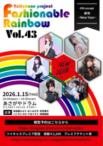 YuiSakane project Fashionable Rainbow vol.43 新年~New Year~ 2026年1月15日 16:00 – 22:00 YuiSakane project Fashionable Rainbow vol.43 新年~New Year~ 出演 有佐美ひより・おくみずき・寺井智子・ハシモトメロ・マヨイマイ・榊音結依 時間 18:40open/19:00start 料金 ¥3500+1D ¥500~ 観覧予約 https://asagaya-drum.com/reservation/ ツイキャスプレミアム ※アーカイブ2週間 https://premier.twitcasting.tv/c:asagayadrum/shopcart/414348 ドリンク応援サイト https://forms.gle/kgW2Utox4y2KDsZz8