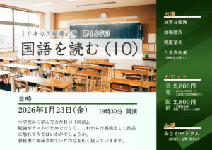 国語を読む(10) ミサキカク毎週公演 2026年1月23日 16:00 – 22:00 国語を読む(10) ミサキカク毎週公演 【出演】加賀谷愛海、加嶋瑠衣、梶原菜央、八木真由美 【時間】開場 19:00/開演 19:30 【料金】 《会場》¥2,800(+1ドリンク¥500〜) 《配信》¥2,800(+手数料¥160) https://misakikaku-weekly.hp.peraichi.com/0123
