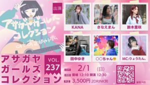 「アサガヤガールズコレクションVol.237」 2026年2月1日 10:00 – 16:00 「アサガヤガールズコレクションVol.237」 【出演】KANA・さなえまん・鈴木里咲・田中ゆき・○○ちゃん😵💫 ※MCのりょうたん。欠席となります 開場 12:10 開演 12:30 〈会場観覧〉3,500円(2ドリンク別) 【観覧予約フォーム】 【ライブ配信】YouTubeあさがやドラムチャンネルにて【無料配信!】 【ウェブ応援ギフト投票】Mudiaサイト