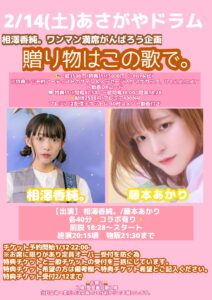 贈り物はこの歌で。 2026年2月14日 16:00 – 22:00 贈り物はこの歌で。 【出演】相澤香純。/藤本あかり 時間:17:50 特典チケット開場 18:00 開場 18:28 開演 料金:来場3500円・特典付きチケット5000円(+各drink代別) 予約:https://tiget.net/events/457946