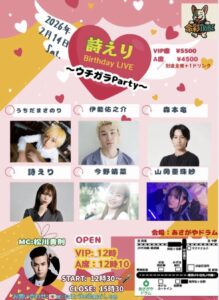 詩えりBirthday LIVE 〜ウチガラParty〜 2026年2月14日 10:00 – 16:00 詩えりBirthday LIVE 〜ウチガラParty〜 出演:詩え・今野靖菜・山岡亜珠紗・伊能佑之介・森本竜・うちだまさのり MC:松川貴則 OPEN VIP12:00 A席12:10 チケット VIP5500円 A席4500円 各1D別