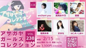 アサガヤガールズコレクションVol.238 2026年2月15日 16:00 – 22:00 アサガヤガールズコレクションVol.238 【出演】enchant you・武岡あや乃・斐梨・福岡未希・まゆな 【MC】井ノ上奈々 開場 18:10 開演 18:30 〈会場観覧〉3,500円(2ドリンク別) 【観覧予約フォーム】 〈mahocastライブ配信〉 3,000円(メッセージ動画特典つきスペシャルチケット♪) 1,000円(視聴のみ) ※ドリンクおごる、ストーン(投げ銭)もあり 【ネットチケット購入サイト】
