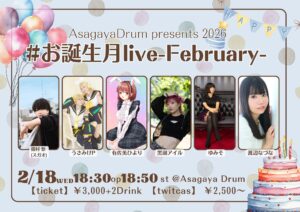 #お誕生月live-February- 2026年2月18日 16:00 – 22:00 #お誕生月live-February- 出演:揚村 悠 (スガオ)・うさみけP・有佐美ひより・黒瀬アイル・ゆみそ・渡辺なづな 時間:18:30open/18:50start 料金:入場¥3,000+2ドリンク(飲めなかったら出演者に贈ってね) 【会場観覧予約】https://asagaya-drum.com/reservation/ 【ツイキャスプレミア配信】 視聴¥2,500 ~※アーカイブ2週間 お待ちください